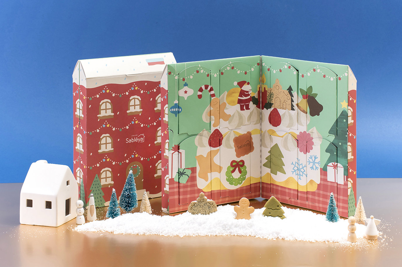 今回Sabléyaがお届けするクリスマス限定アドベントカレンダーは、幅190mm×奥行50mm×高さ263mmの家型パッケージです。中には、ツリーやクッキーマンなどクリスマスらしい形のピスタチオ味やメープル味といった季節限定のサブレが入っています。廣川株式会社パッケージ事業部が製作したこのアドベントカレンダーパッケージについてご紹介します。